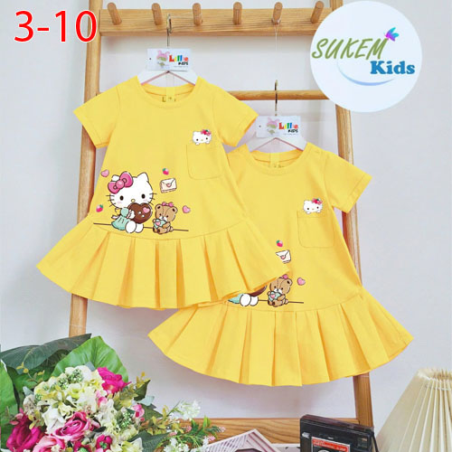A479173 - Đầm may tay phối tùng dáng A đuôi cá ép hình Kitty kiểu dáng dễ mặc đắp túi_Size 3-10