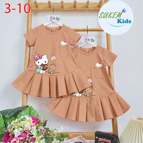 A479174 - Đầm may tay phối tùng dáng A đuôi cá ép hình Kitty kiểu dáng dễ mặc đắp túi_Size 3-10