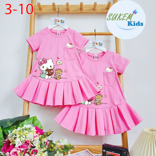 A479175 - Đầm may tay phối tùng dáng A đuôi cá ép hình Kitty kiểu dáng dễ mặc đắp túi_Size 3-10