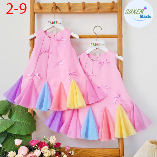 A479349 - Đầm may tay đuôi cá phối lưới cầu vồng đính nơ Phụ kiện 2 lớp pom A đuôi cá nhún lưới cắt