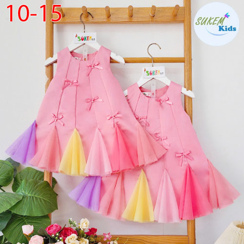 A479354 - Đầm may tay đuôi cá phối lưới cầu vồng đính nơ Phụ kiện 2 lớp pom A đuôi cá nhún lưới cắt