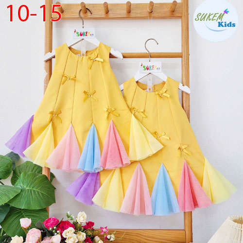 A479356 - Đầm may tay đuôi cá phối lưới cầu vồng đính nơ Phụ kiện 2 lớp pom A đuôi cá nhún lưới cắt