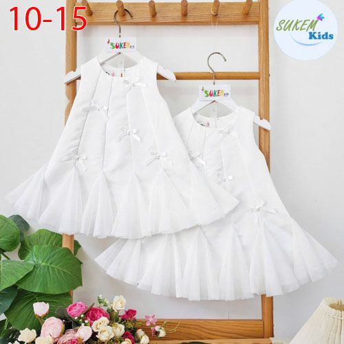 A479359 - Đầm may tay đuôi cá phối lưới cầu vồng đính nơ Phụ kiện 2 lớp pom A đuôi cá nhún lưới cắt