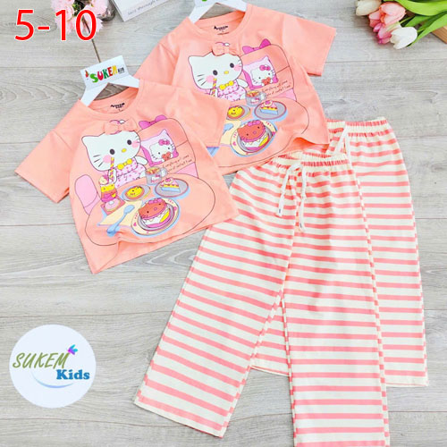 A479841 - Set bé gái áo may ngắn tay dễ thương với hình kitty quần dài ống suông chạy sọc_Size 5-10