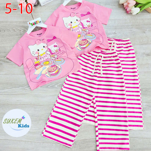A479846 - Set bé gái áo may ngắn tay dễ thương với hình kitty quần dài ống suông chạy sọc_Size 5-10