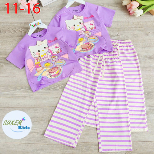 A479848 - Set bé gái áo may ngắn tay dễ thương với hình kitty quần dài ống suông chạy sọc_Size 11-16