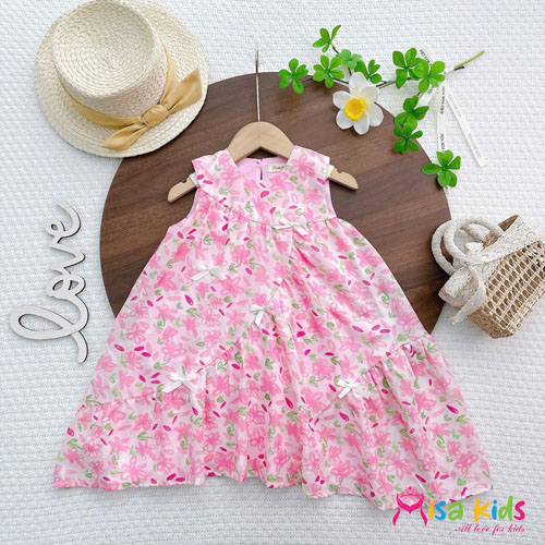 A480523 - Đầm tơ in hoa lót lụa nguyên đầm dáng xòe, babydoll, gắn nơ làm điểm nhấn_Size 1-10