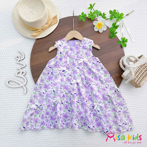 A480524 - Đầm tơ in hoa lót lụa nguyên đầm dáng xòe, babydoll, gắn nơ làm điểm nhấn_Size 1-10