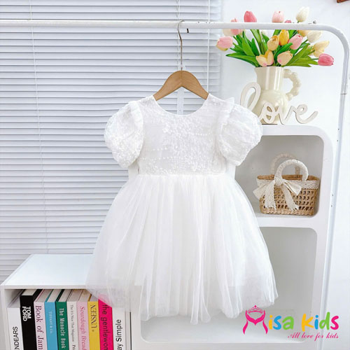 A480814 - Đầm công chúa xòe ren hoa phối lưới trơn tay phồng nhún dáng xòe phối nơ lưng_Size 1-10