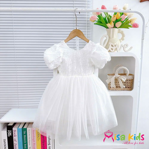 A480815 - Đầm công chúa xòe ren hoa phối lưới trơn tay phồng nhún dáng xòe phối nơ lưng_Size 1-10