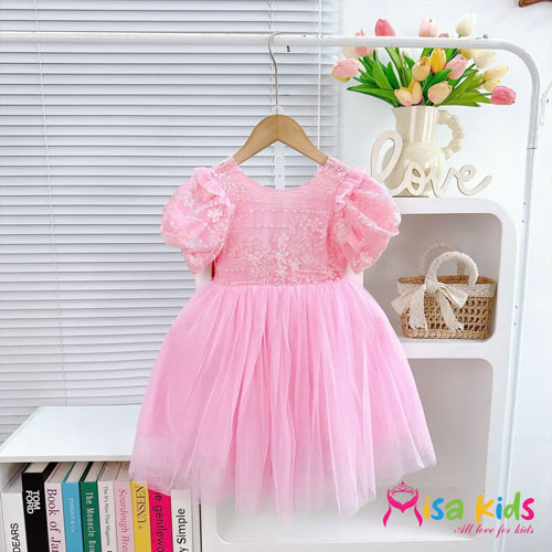 A480817 - Đầm công chúa xòe ren hoa phối lưới trơn tay phồng nhún dáng xòe phối nơ lưng_Size 1-10