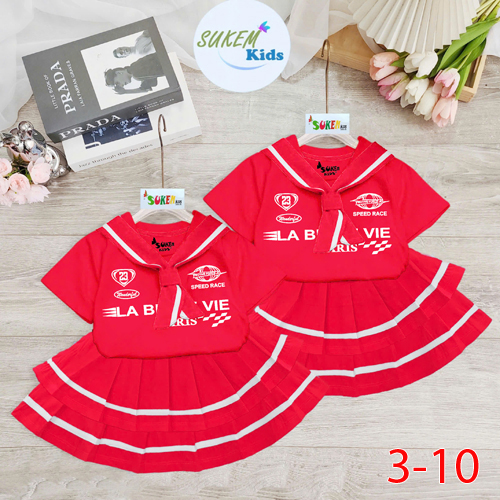A484353 - Set váy áo thun ngắn tay cổ trụ caravat cute in chữ chân váy may xếp chạy sọc thể thao_Siz