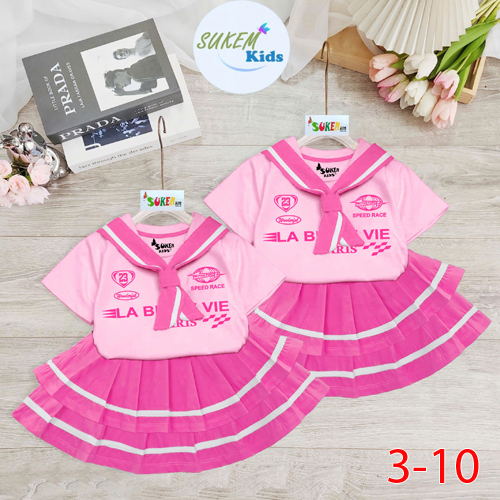 A484354 - Set váy áo thun ngắn tay cổ trụ caravat cute in chữ chân váy may xếp chạy sọc thể thao_Siz