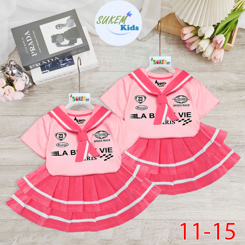 A484361 - Set váy áo thun ngắn tay cổ trụ caravat cute in chữ chân váy may xếp chạy sọc thể thao_Siz