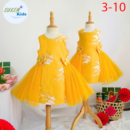 A484375 - Đầm công chúa may pom A nhún lưới xòe 2 bên đính Nơ kết hạt châu 1 lớp vải ren thêu hoa_Si