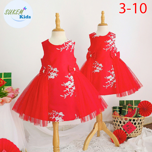A484376 - Đầm công chúa may pom A nhún lưới xòe 2 bên đính Nơ kết hạt châu 1 lớp vải ren thêu hoa_Si