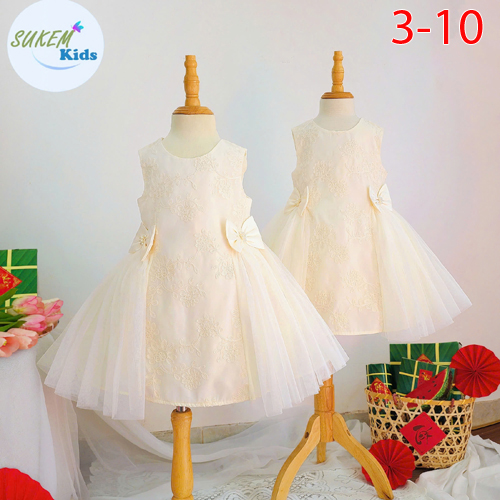 A484377 - Đầm công chúa may pom A nhún lưới xòe 2 bên đính Nơ kết hạt châu 1 lớp vải ren thêu hoa_Si