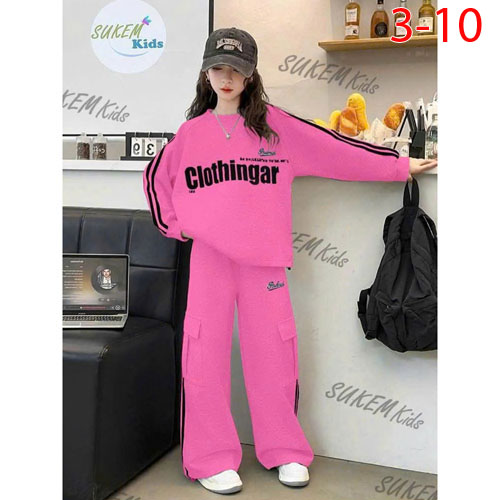 A484624 - Bộ dài tay da cá bé gái áo chạy dây viền thể theo in chữ nổi quần dài suông có dây bo rút