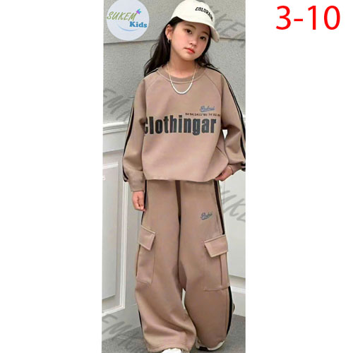 A484626 - Bộ dài tay da cá bé gái áo chạy dây viền thể theo in chữ nổi quần dài suông có dây bo rút