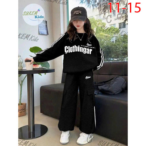 A484634 - Bộ dài tay da cá bé gái áo chạy dây viền thể theo in chữ nổi quần dài suông có dây bo rút