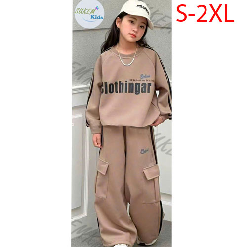 A484638 - Bộ dài tay da cá bé gái áo chạy dây viền thể theo in chữ nổi quần dài suông có dây bo rút