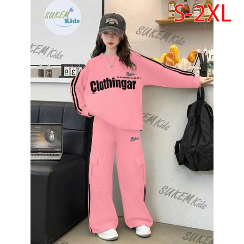 A484639 - Bộ dài tay da cá bé gái áo chạy dây viền thể theo in chữ nổi quần dài suông có dây bo rút