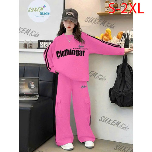 A484640 - Bộ dài tay da cá bé gái áo chạy dây viền thể theo in chữ nổi quần dài suông có dây bo rút