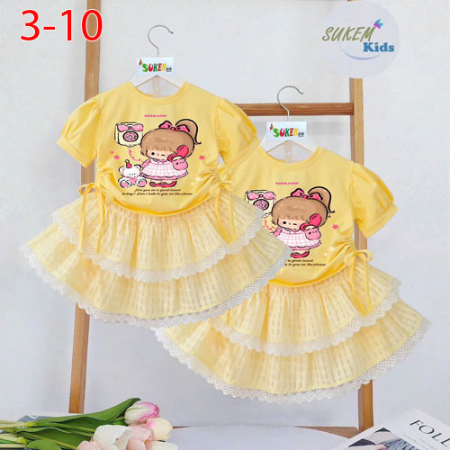 A484930 - Set thiết kế áo rút dây 2 bên dễ thương cưng xỉu tay phồng xinh in cô bé chân váy ren may