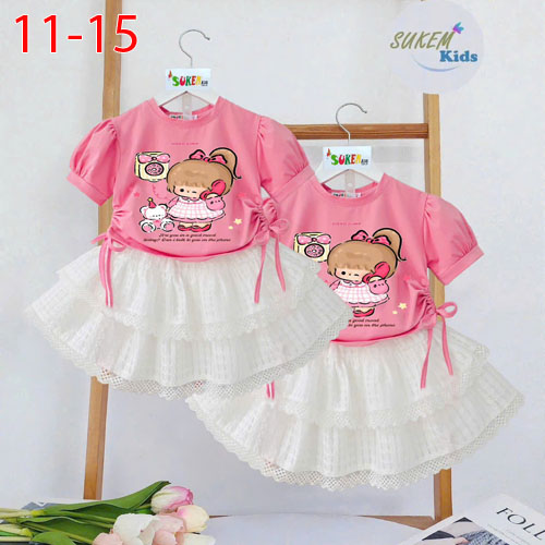 A484934 - Set thiết kế áo rút dây 2 bên dễ thương cưng xỉu tay phồng xinh in cô bé chân váy ren may