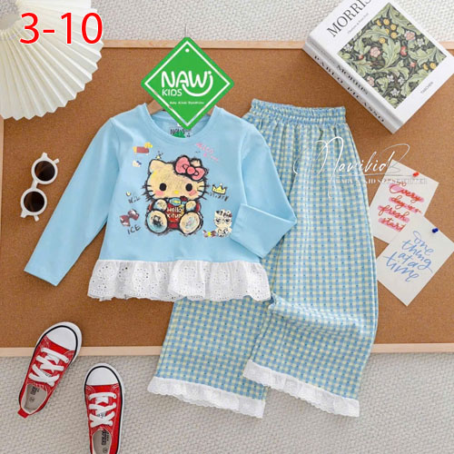 A485504 - Set bộ tay dài quần dài in Kitty kèm phụ kiện nơ áo thun tay dài viền ren quần sọc linen c