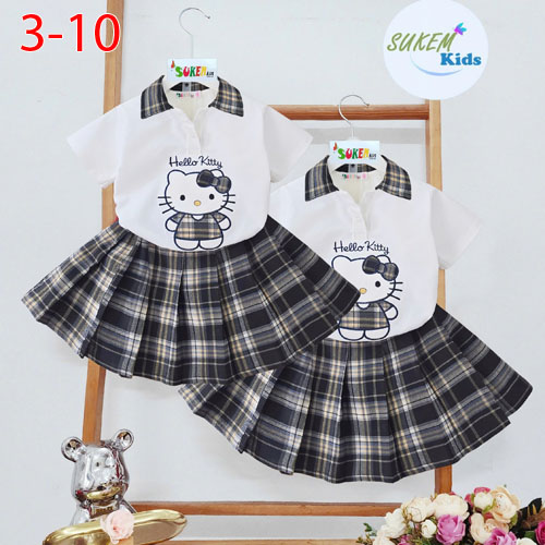 A486113 - Set váy áo may cổ trụ phối karo thêu đắp Kitty chân váy may xếp ly vải karo_Size 3-10