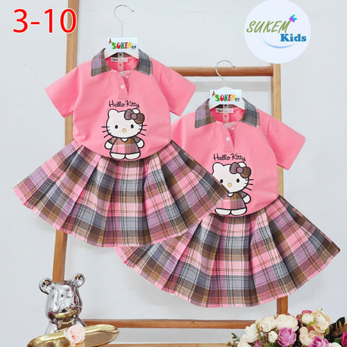 A486115 - Set váy áo may cổ trụ phối karo thêu đắp Kitty chân váy may xếp ly vải karo_Size 3-10