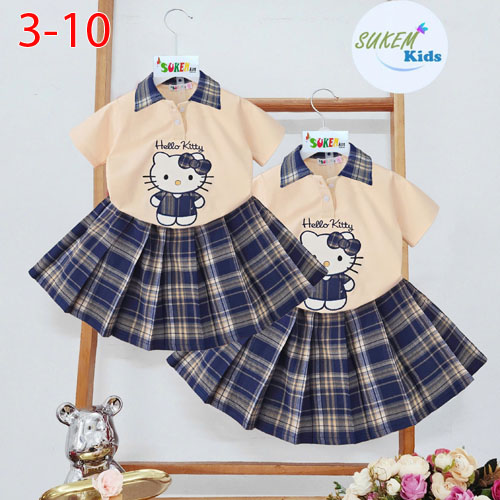 A486117 - Set váy áo may cổ trụ phối karo thêu đắp Kitty chân váy may xếp ly vải karo_Size 3-10