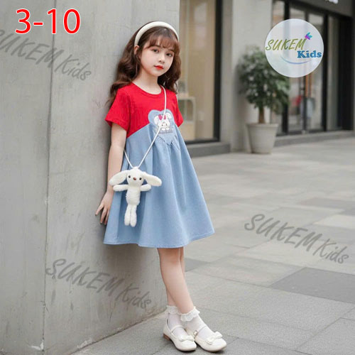 A486625 - Đầm jean kèm phụ kiện giỏ Thỏ bông siêu cưng cho bé gái phối áo thun cotton 4c đắp trái ti
