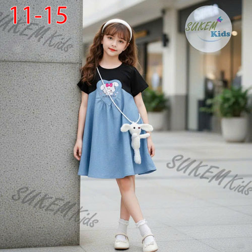 A486629 - Đầm jean kèm phụ kiện giỏ Thỏ bông siêu cưng cho bé gái phối áo thun cotton 4c đắp trái ti