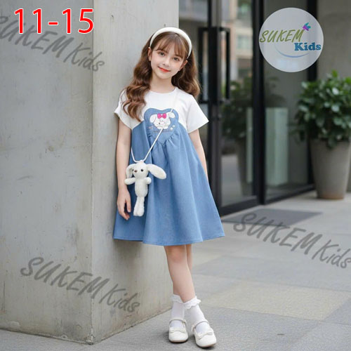 A486632 - Đầm jean kèm phụ kiện giỏ Thỏ bông siêu cưng cho bé gái phối áo thun cotton 4c đắp trái ti