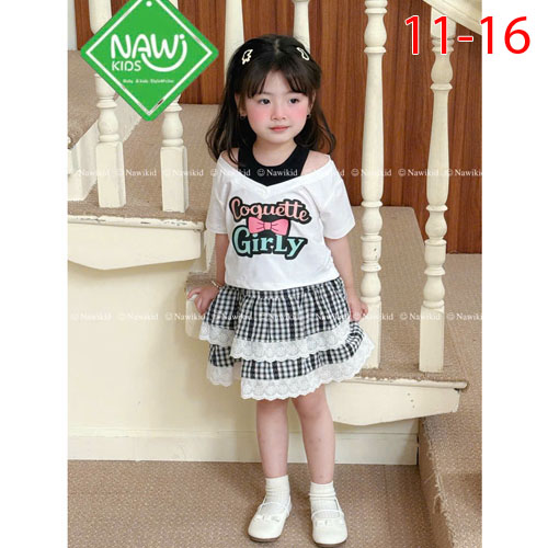 A486938 - Set váy carô 2 tầng viền ren mix cùng áo kiểu xinh xắn in nơ chữ Coguette Girly_Size 11-16
