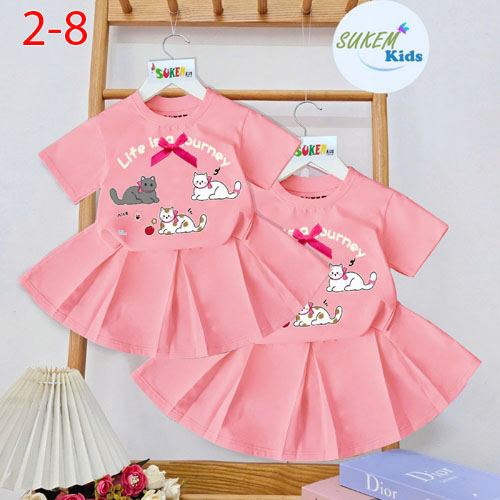 A487013 - Set váy áo thun ngắn tay in ép mèo đính nơ ruy băng chân váy may xếp ly_Size 2-8