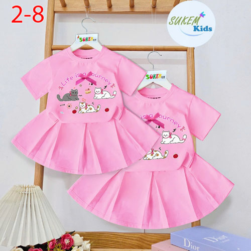 A487014 - Set váy áo thun ngắn tay in ép mèo đính nơ ruy băng chân váy may xếp ly_Size 2-8