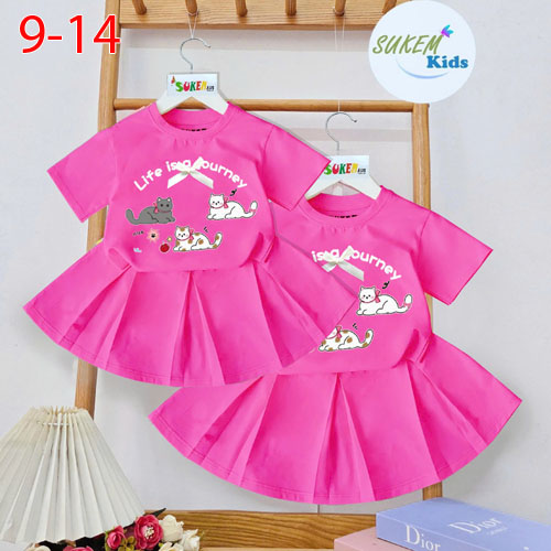 A487018 - Set váy áo thun ngắn tay in ép mèo đính nơ ruy băng chân váy may xếp ly_Size 9-14