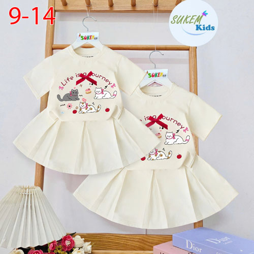 A487019 - Set váy áo thun ngắn tay in ép mèo đính nơ ruy băng chân váy may xếp ly_Size 9-14