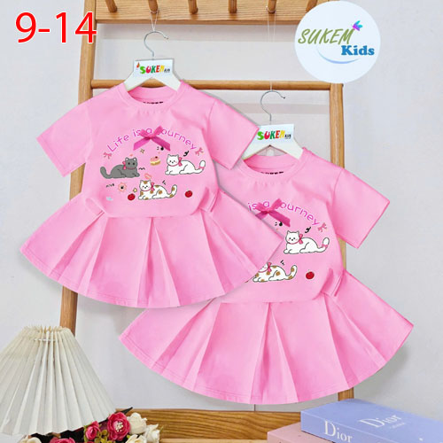 A487021 - Set váy áo thun ngắn tay in ép mèo đính nơ ruy băng chân váy may xếp ly_Size 9-14