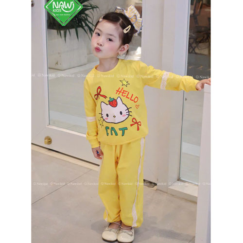 A487124 - Set bộ tay dài hàng thu đông cute thun cotton 4c tay áo viền ren in dẻo chữ Hello quần dài