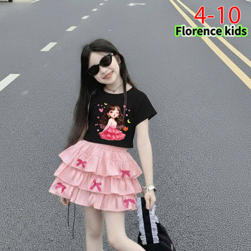 A487317 - Set váy cực xinh cho bé áo thun cotton 4c in cô bé chân váy lụa hàn 3 tầng đính nơ_Size 4-