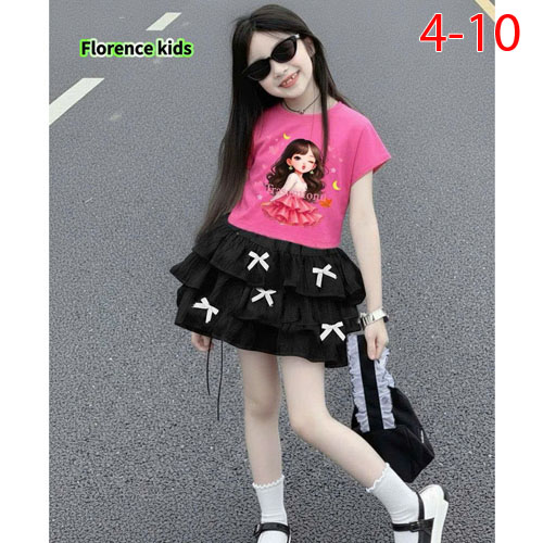 A487319 - Set váy cực xinh cho bé áo thun cotton 4c in cô bé chân váy lụa hàn 3 tầng đính nơ_Size 4-