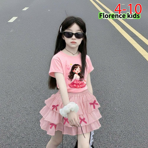 A487320 - Set váy cực xinh cho bé áo thun cotton 4c in cô bé chân váy lụa hàn 3 tầng đính nơ_Size 4-