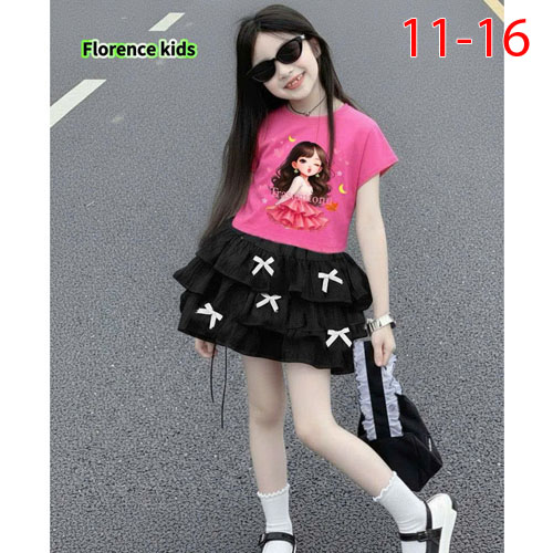 A487326 - Set váy cực xinh cho bé áo thun cotton 4c in cô bé chân váy lụa hàn 3 tầng đính nơ_Size 11