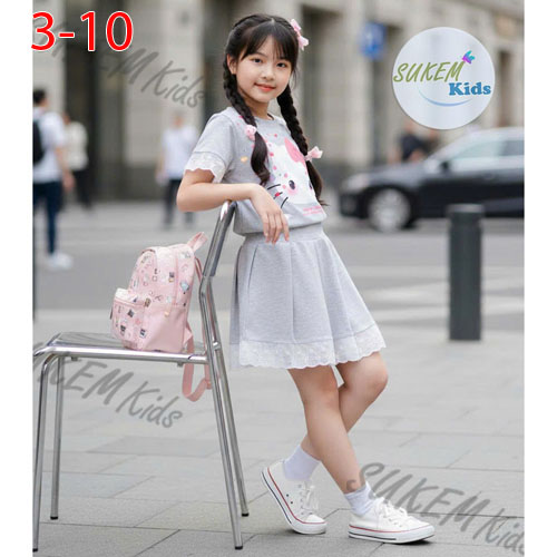 A487699 - Sét váy áo may ngắn tay phối ren ép Kitty chân váy may xếp ly chạy ren_Size 3-10