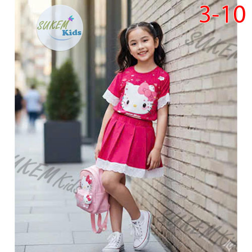 A487701 - Sét váy áo may ngắn tay phối ren ép Kitty chân váy may xếp ly chạy ren_Size 3-10