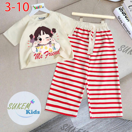 A487791 - Set bé gái thun coton 4c áo may ngắn tay dễ thương với hình chibi quần dài ống suông chạy